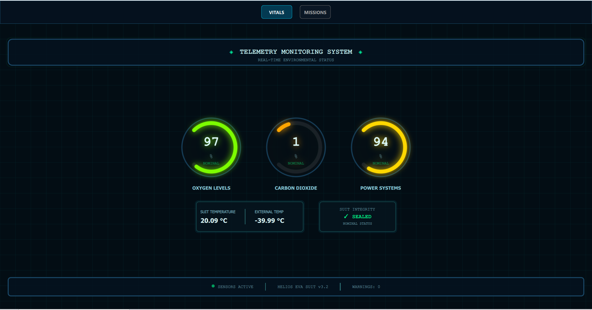 Helios SMS is an advanced spacesuit telemetry monitoring and mission management system designed for space exploration missions. Built with Python and PySide6/Qt and QML, it provides real-time monitoring of spacesuit vitals, mission tracking, and safety alert management